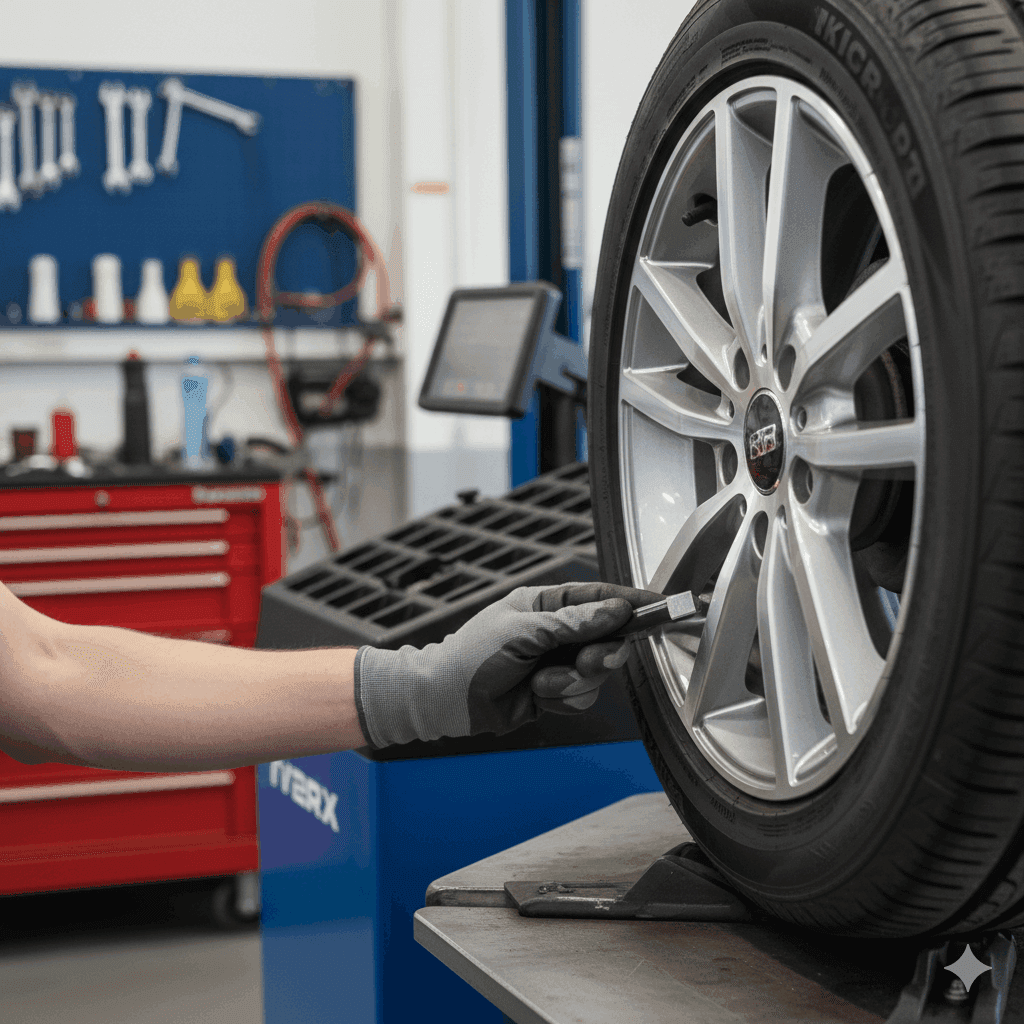 Kuvaehdotus (ALT): Tasapainotuskone rengashuollon työpisteessä, laser osoittaa liimapainon paikan alumiinivanteella.